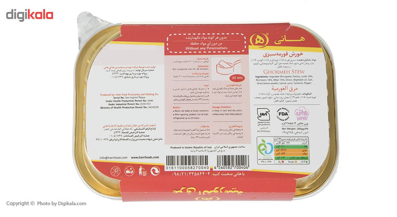 «هانی» انواع خورشها را بهصورت آماده در اختیار مصرفکنندگان قرار داده است؛ بنابراین تعجبی ندارد که خورش قورمهسبزی که یکی از محبوبترین غذاهای ایرانی است هم در بین این خورشها خودنمایی کند. خورش قورمهسبزی که ماده تشکیلدهنده اصلی آن لوبیا، سبزی قورمه (48% جعفری، 24% تره، 22% روغن سرخکردنی و 6% شنبلیله) و گوشت قرمز است،در بستهبندی آلومینیومی عرضه شده است.