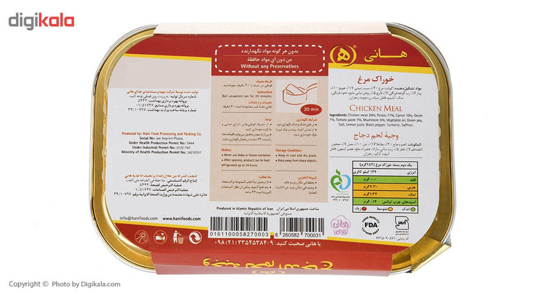 هانی یکی از شرکتهای تولید کننده غذای آماده باکیفیت است و اکثر غذاهای ایرانی را بهصورت بستهبندی شده در ظروف محکم، برای مصرف کنندگان تولید میکند. خوراک مرغ غذای سالم و مقوی است که توسط هانی بهصورت کنسرو درآمده تا افرادی که زمان کافی برای پخت این غذا را ندارند، بتوانند از آن لذت ببرند.