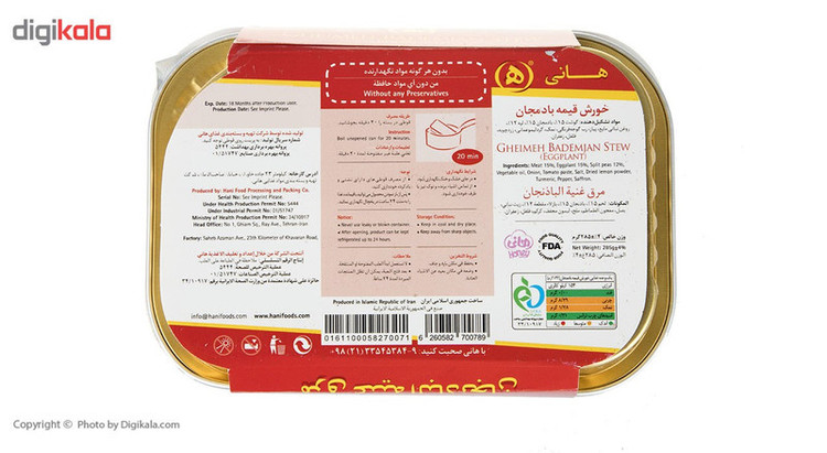 قیمه بادمجان را بیشتر دوست دارید یا قیمه سیبزمینی؟ اگر با شنیدن اسم قیمه بادمجان ذوق میکنید، «هانی» امکان دسترسی به آن را بدون رفتن به رستوران و بدون صرف وقت برای آشپزی فراهم کرده است. قیمه بادمجان را هم به صورت مخلوط با پلو مصرف میکنند و هم به صورت خورش روی برنج میریزند. هانی با غذاهای آمادهاش در این مواقع به داد شکم ما میرسد. کنسروها زمان تجربه غذاهای خوشمزه را کوتاه کردهاند و به راحتی میتوان با صرف زمان کمتر، یک غذای خوشمزه و مفید را تجربه کرد. هانی یکی از شرکتهای تولید کننده کنسروهای باکیفیت است و اکثر غذاهای ایرانی را بهصورت کنسرو برای مصرفکنندگان تولید میکند. خورش قیمه هانی، تا 24 ساعت پس از بازکردن قابل استفاده است و 280 گرم وزن دارد. بستهبندی این غذای آماده از آلومینیوم است و برای محیط زیست خطری ندارد. برای گرمکردن قیمه بادمجان هانی، میتوانید از ماکروویو استفاده کنید اما باید در آن باید باز باشد تا غذا بهخوبی گرم شود.